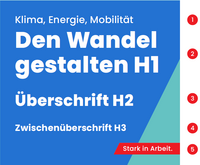 - Rubrik oder Ergänzung der Überschrift H1 (H = Headline): Poppins Medium, weiß/dunkelblau